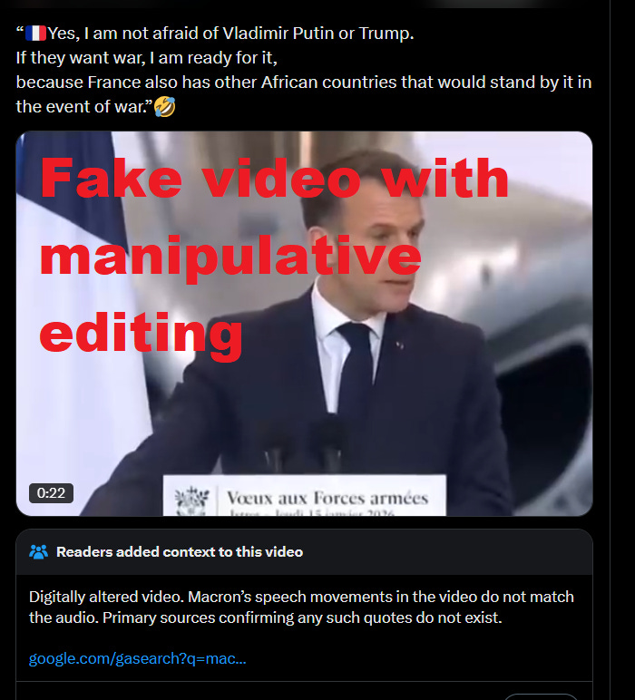 On 20 Jan 2026, the X account SilentlySirs posted a deepfake video falsely claiming French President Emmanuel Macron declared war readiness against Putin and Trump, backed by African allies, which amassed 2.2 million views in days.